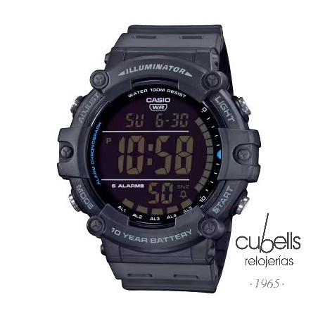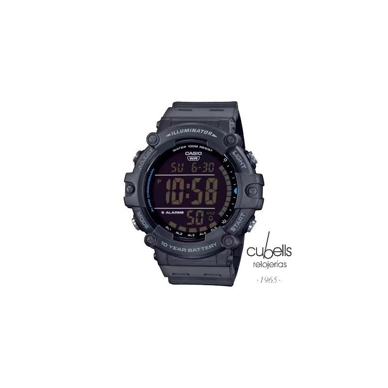 Casio deportivo AE-1500WH-8BVE de resina tanto la caja como la correa. Esfera en negativo y las medidas son L 54.4 × W 51.2 × H 15.7 mm y el peso de 57g. Cronómetro 1/100 segundos, doble horario, 5 alarmas, resistente al agua hasta 100 metros y luz de fondo LED.