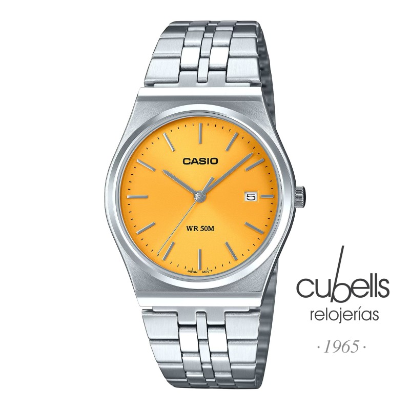 Casio MTP-B145D-9AV de acero inoxidable y resistente al agua hasta 5 bares. Las medidas son L 40 × An 35 × Al 7.4 mm y el peso 82g. Cristal mineral, indicación analógica de 3 manecillas (hora, minutos y segundos) y calendario.