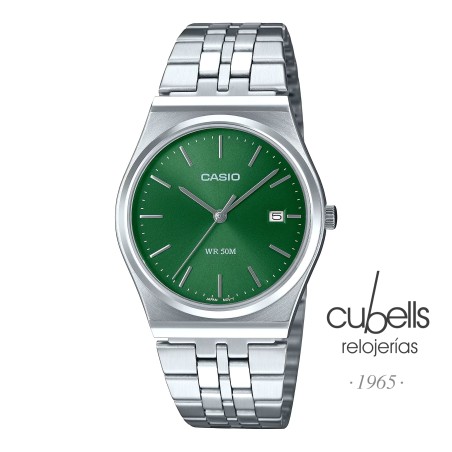 Casio MTP-B145D-3AV de acero inoxidable y resistente al agua hasta 5 bares. Las medidas son L 40 × An 35 × Al 7.4 mm y el peso 82g. Cristal mineral, indicación analógica de 3 manecillas (hora, minutos y segundos) y calendario.
