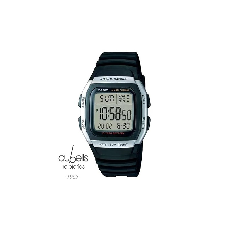 Casio deportivo W-96H-1AVES de resina. Resistente al agua 50 metros. Las medidas son 43.9 × 35.7 × 12.5 mm y el peso de 32g. Cronómetro de 1/100 de segundo, luz verde, formato 12/24 horas, marca: horas, minutos, segundos, pm, año, mes, fecha y día.