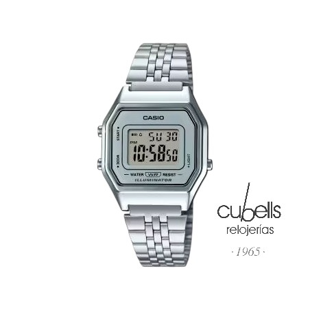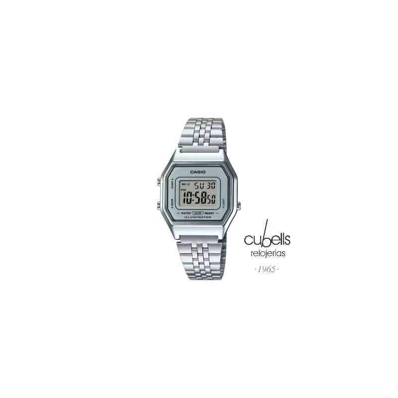 Casio Vintage LA680WEA-7 de resina y cromado. Cadena de acero inoxidable y cierre ajustable. Las dimensiones L 33.5 × An 28.6 × Al 8.6 mm y peso de 36g. Resistente al agua y unisex.